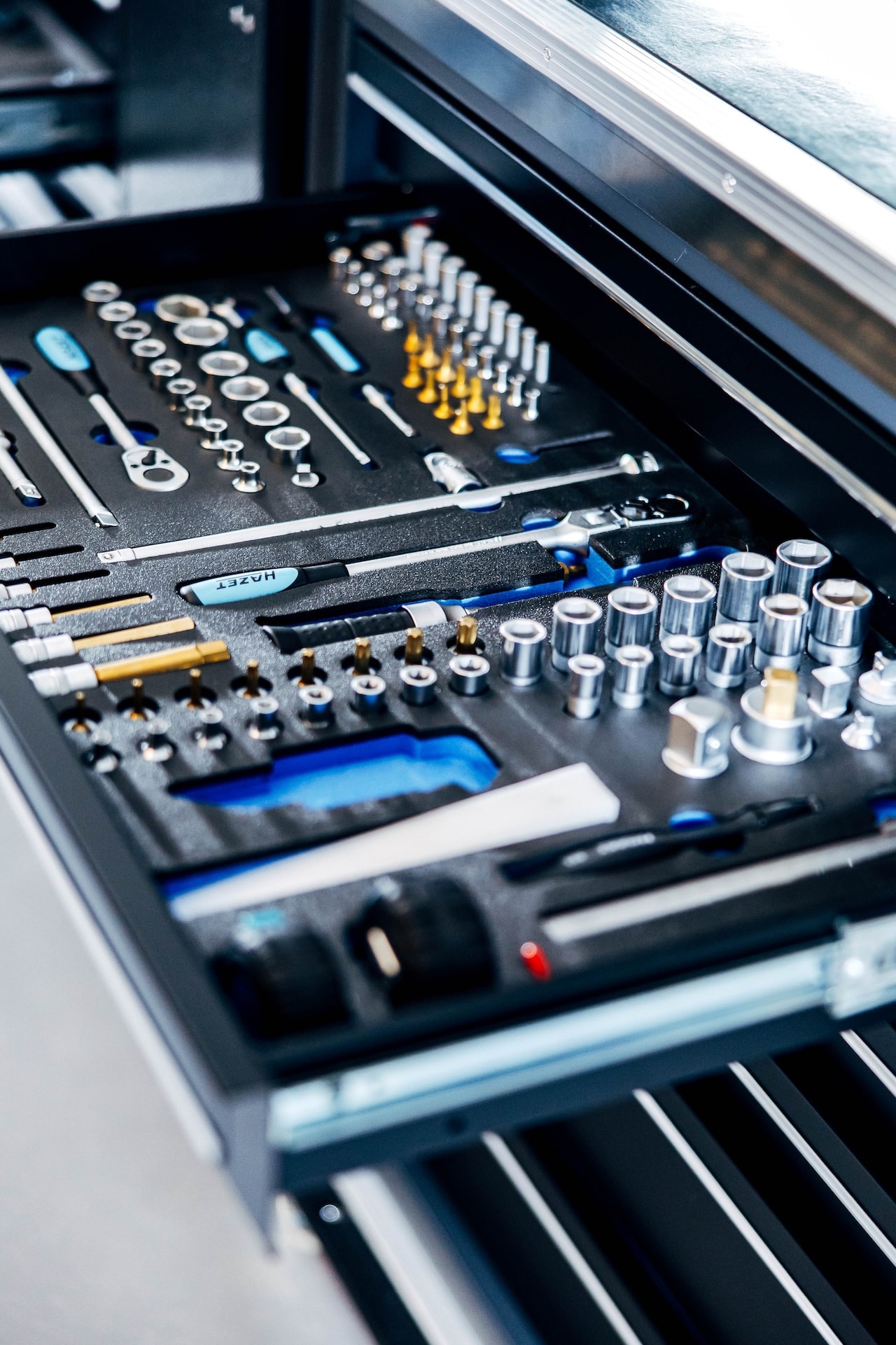 Stable construction with integrated tool storage – ready for daily use in professional racing environments.