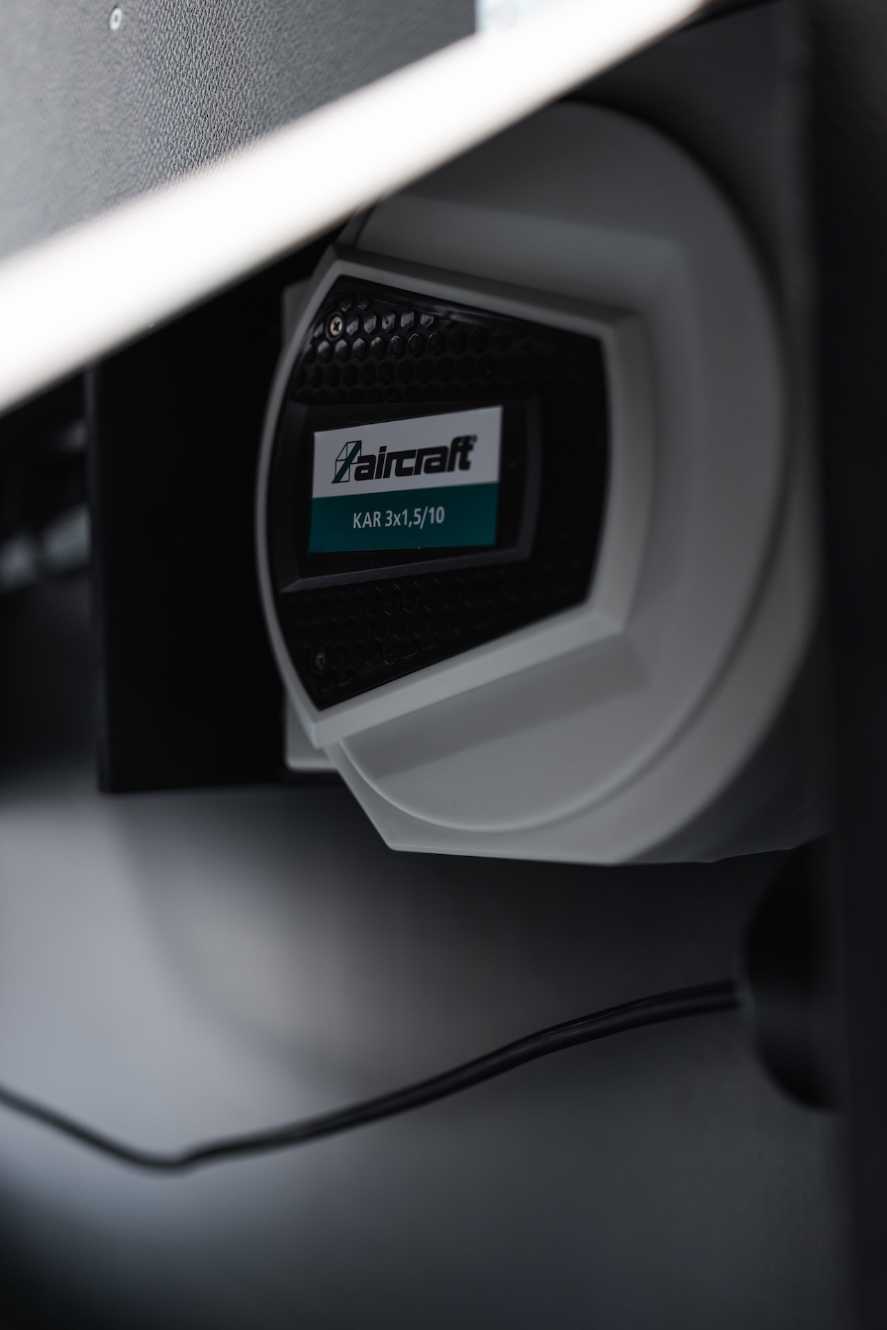 Power is supplied via an integrated, self-retracting 9-meter cable, with two additional 10-meter extension cables allowing power distribution to both sides.